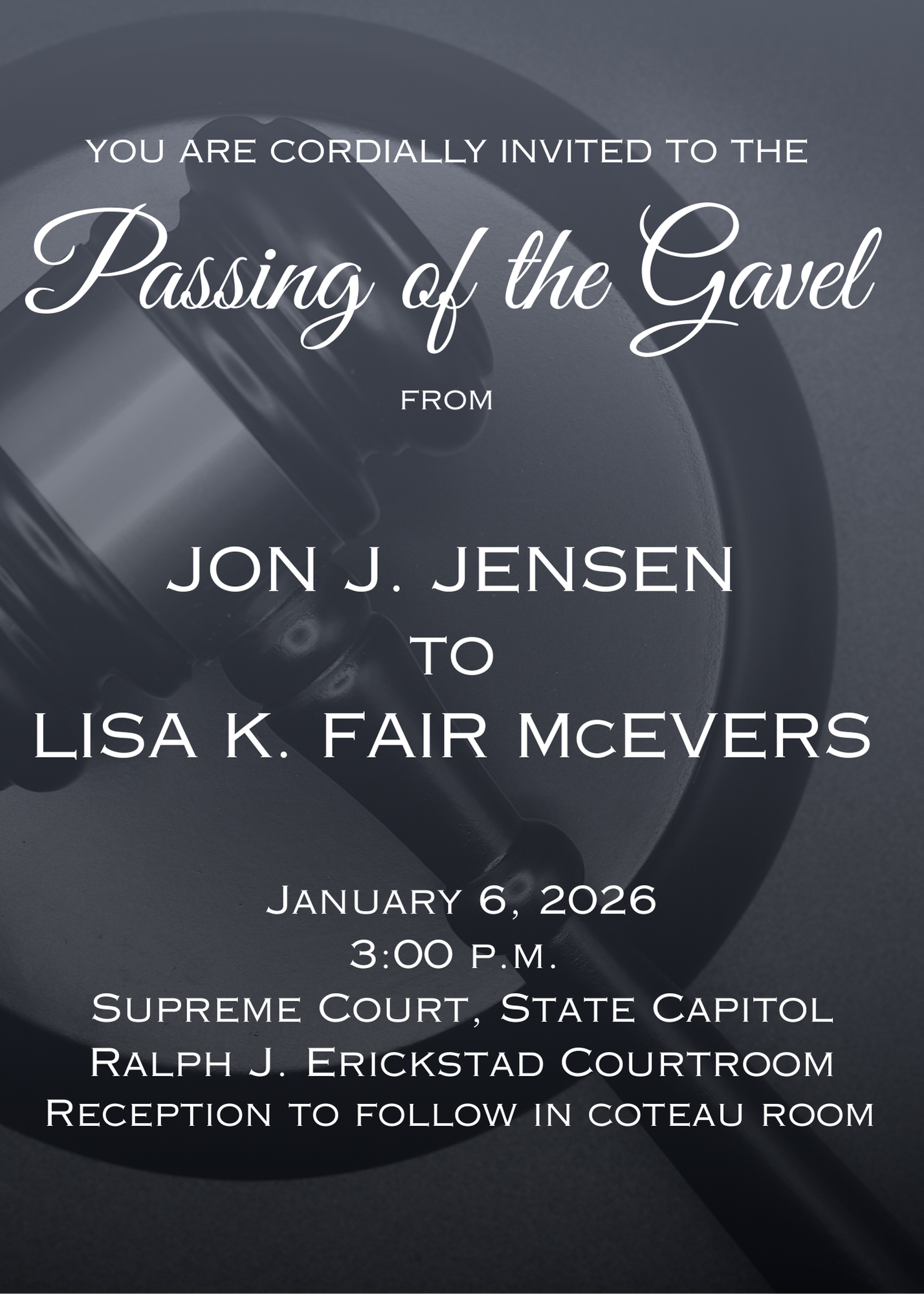 The passing of the gavel ceremony from Chief Justice Jon J. Jensen to Chief Justice-elect Lisa K. Fair McEvers will take place Jan. 6. Justice McEvers was elected by the North Dakota Justices and Judges to replace Chief Justice Jensen and will assume her new duties on Jan. 1.
