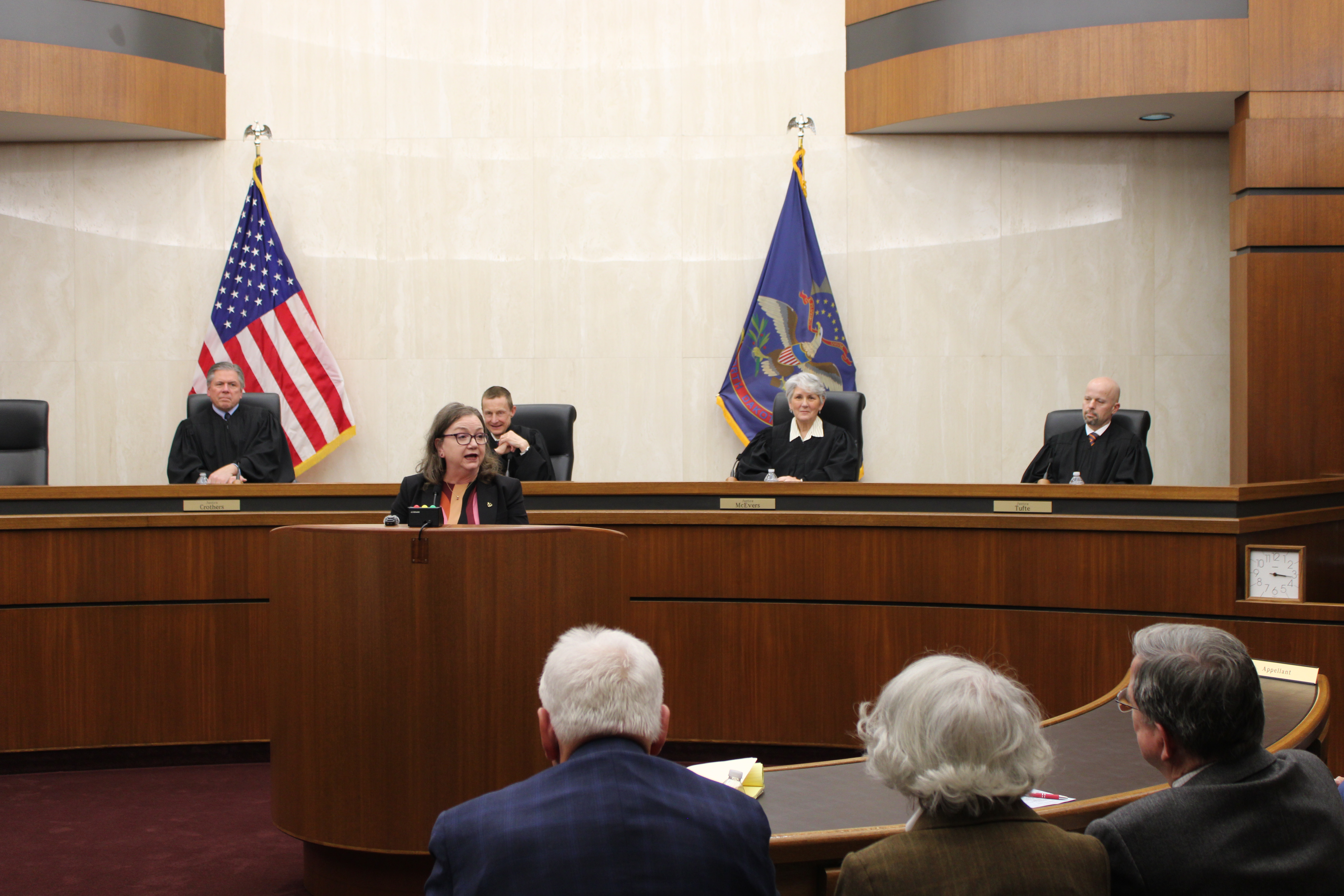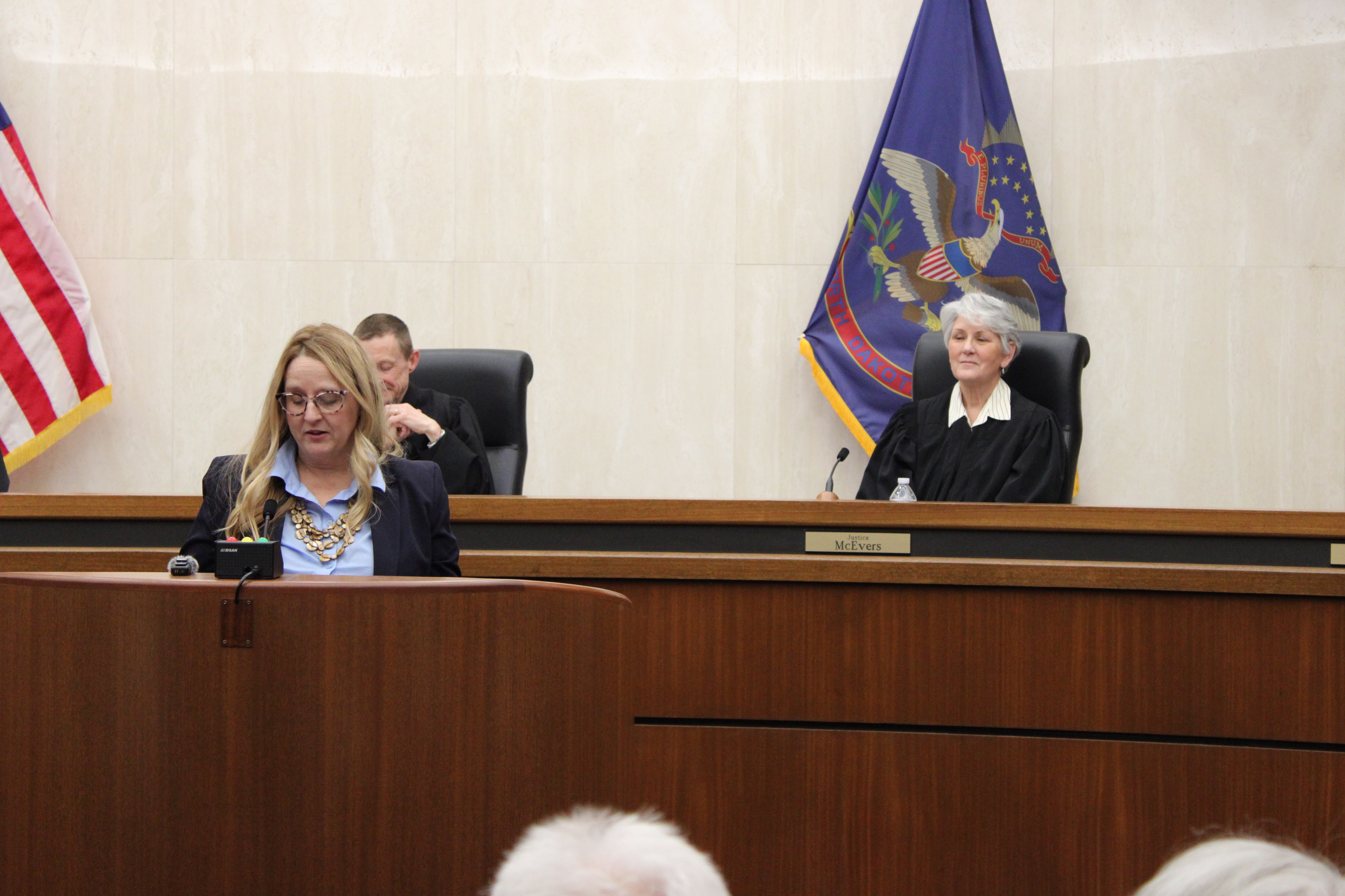 Chief Justice Fair McEvers addresses the many attendees, including her family, former justices of the state supreme court, Governor Kelly Armstrong, Attorney General Drew Wrigley, and U.S. District Court Judge Daniel Traynor.