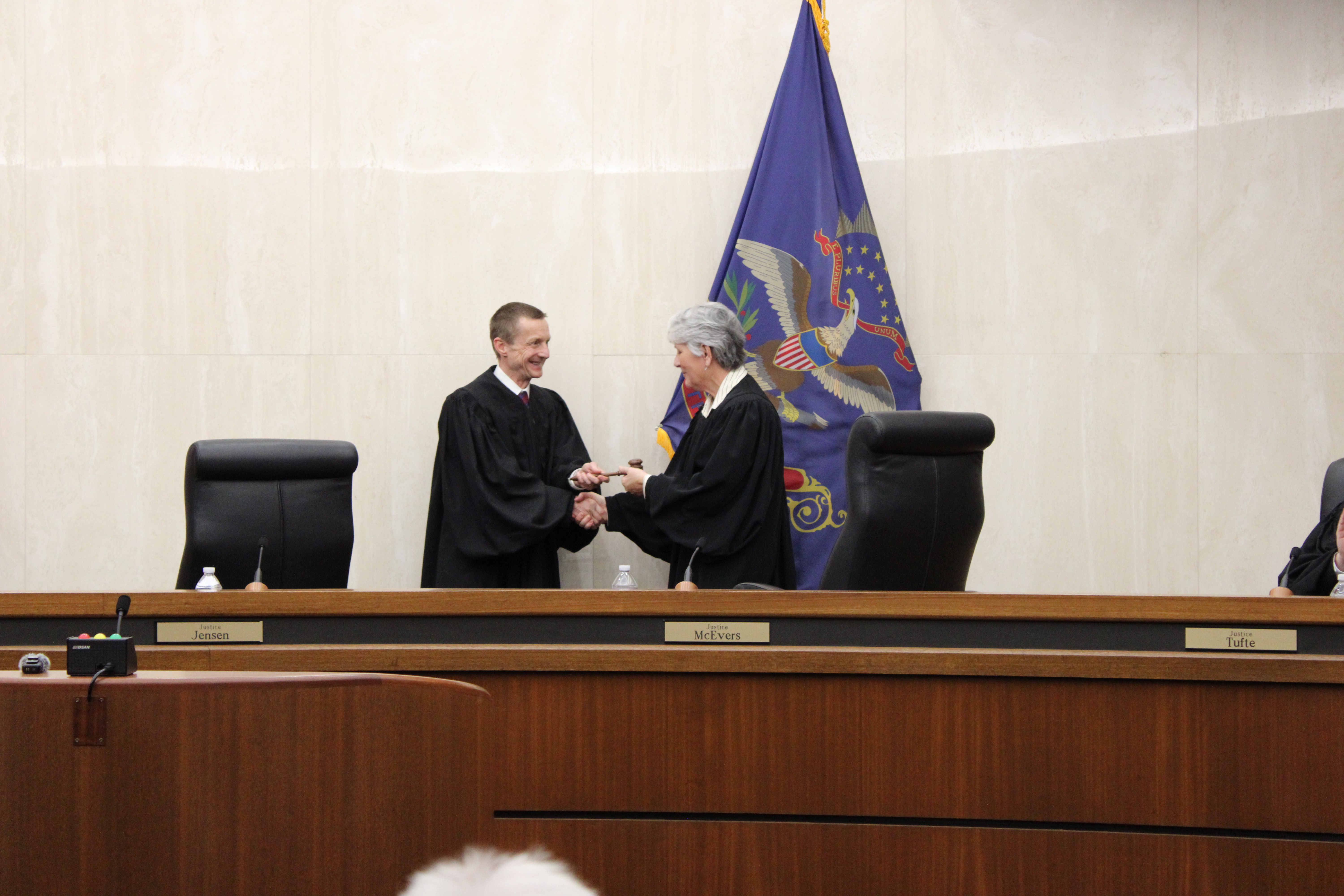 Chief Justice Lisa Fair McEvers receives the gavel from former Chief Justice Jon J. Jensen.